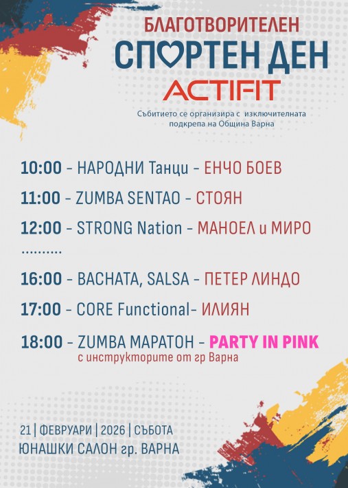 Събитието ще се проведе на 21.02.2026 г. (събота) от 09:00 ч. до 20:00 ч. в Юнашкия салон. Организаторите са подготвили разнообразна програма от спортни активности, която ще завърши със Zumba маратон. Тренировките ще бъдат водени от инструктори по групови занимания от Варна, като в тях могат да се включат желаещи от всички възрасти. Входът за „Благотворителен спортен ден“ е свободен.