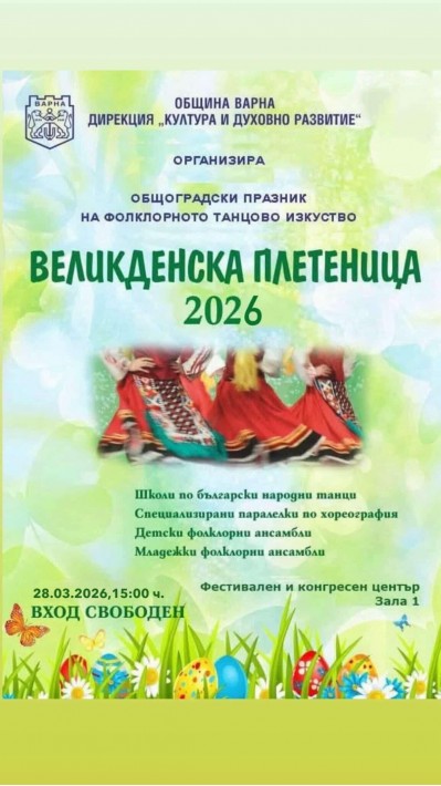 Над 700 изпълнители ще участват в традиционния Общоградски фолклорен празник „Великденска плетеница“. Събитието ще се проведе на 28 март, събота, от 15:00 ч. във Фестивалния и конгресен център във Варна. Входът е свободен.