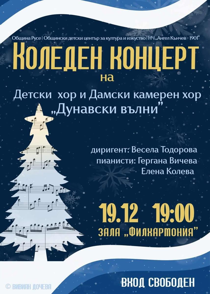 На 19 декември от 19 часа в зала „Филхармония“ ще се състои Коледен концерт на Детския хор „Дунавски вълни” и Дамския хор „Дунавски вълни” при НЧ „Ангел Кънчев – 1901″ с диригент Весела Тодорова. На рояла ще акомпанират Гергана Вичева и Елена Колева. Входът е свободен.