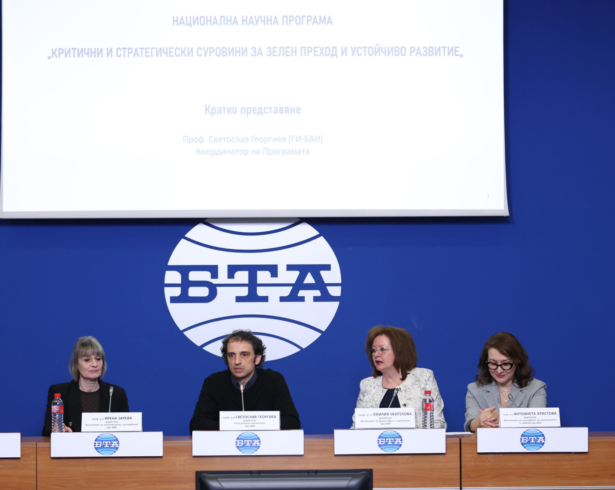 В пресконференция за представянето на първия етап от изпълнението на Националната научна програма „Критични и стратегически суровини за зелен преход и устойчиво развитие“ участваха четирима директори на институти при БАН – проф. д-р Ирена Зарева от Института за икономически изследвания, проф. д-р Светослав Георгиев от Геологическия институт, проф. дсн Емилия Ченгелова от Института по философия и социология и проф. д-р Антоанета Христова от Института за изследване на населението и човека.