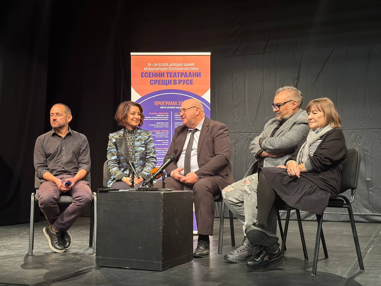 В Камерната зала на Доходното здание днес се състоя пресконференция за провеждането на второто издание на „Есенни театрални срещи“. Заместник-кметът Енчо Енчев, директорът на Драматичния театър „Сава Огнянов“ Боян Иванов и Катя Костова – директор на „Арт театър Берлин“, разказаха за участниците в международния театрален форум и споделиха акценти от програмата. Фестивалът ще бъде открит довечера в 19 ч. с ексцентричната комедия на Драматичен театър „Сава Огнянов“ „Последният етаж“. Гост актьор в премиерното заглавие ще бъде Албена Михова. Фестивалът се провежда до 26 октомври и е с подкрепата на Министерство на културата, Община Русе, Национален фонд „Култура“ и Арт театър „Берлин“.