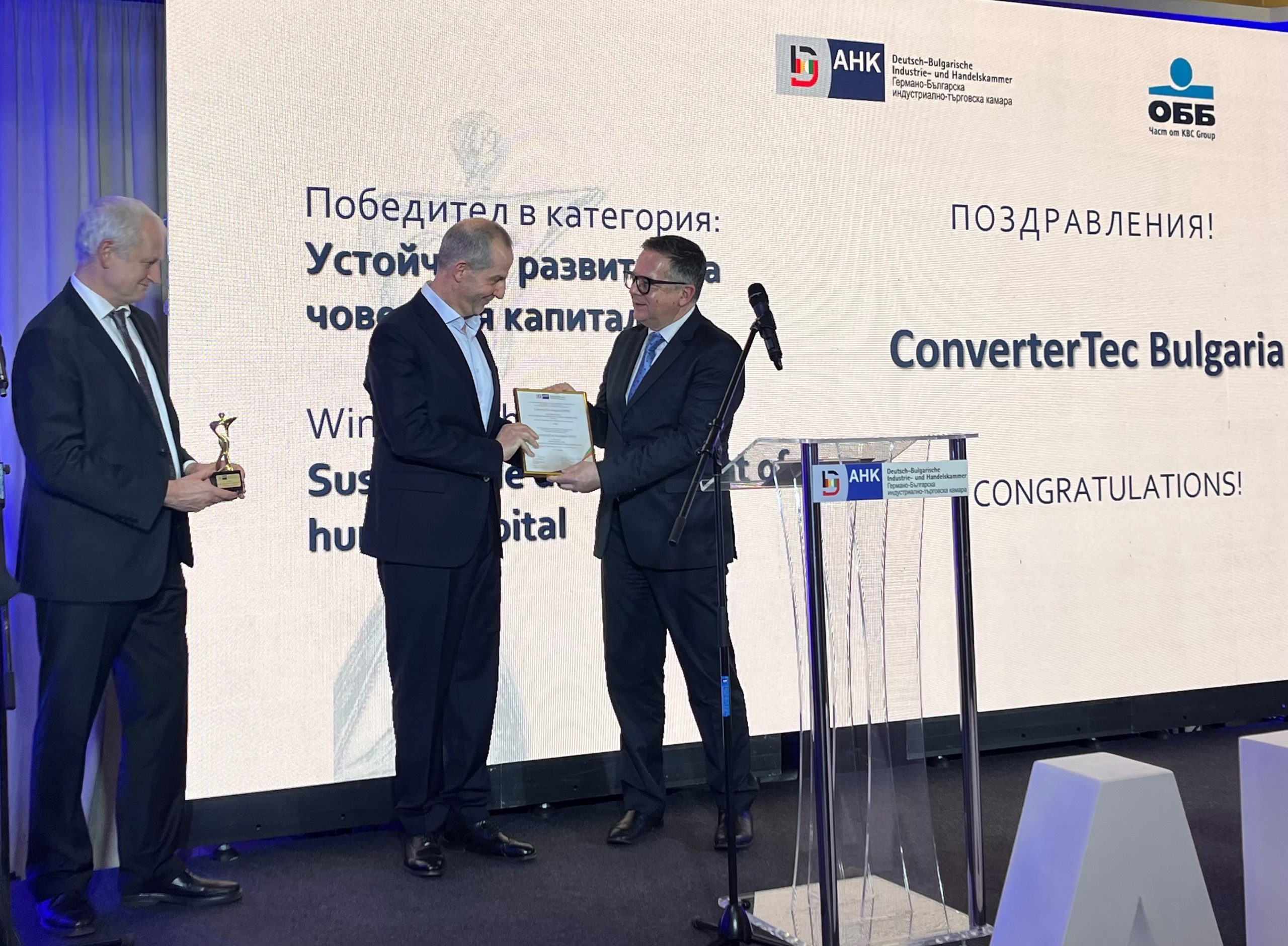 Зам.-министър Барбалов: Двустранната търговия между България и Германия е нараснала 16 пъти за последните 30 годиниЗам.-министър Барбалов връчи наградата в категория „Устойчиво развитие на човешкия капитал“, а победител стана „КонвертерТек България“ (ConverterTec Bulgaria). Компанията прилага дългосрочна стратегия за управление на персонала, фокусирана върху систематично развитие, подготовка на бъдещи лидери и насърчаване на ключови компетентности за бъдещето. Чрез сътрудничество с университети и активен трансфер на знания в рамките на международната група младите инженери получават ранна и практическа професионална подготовка. Като част от германска индустриална група „КонвертерТек“ те са ангажирани с енергийния преход и регионалното развитие в България.