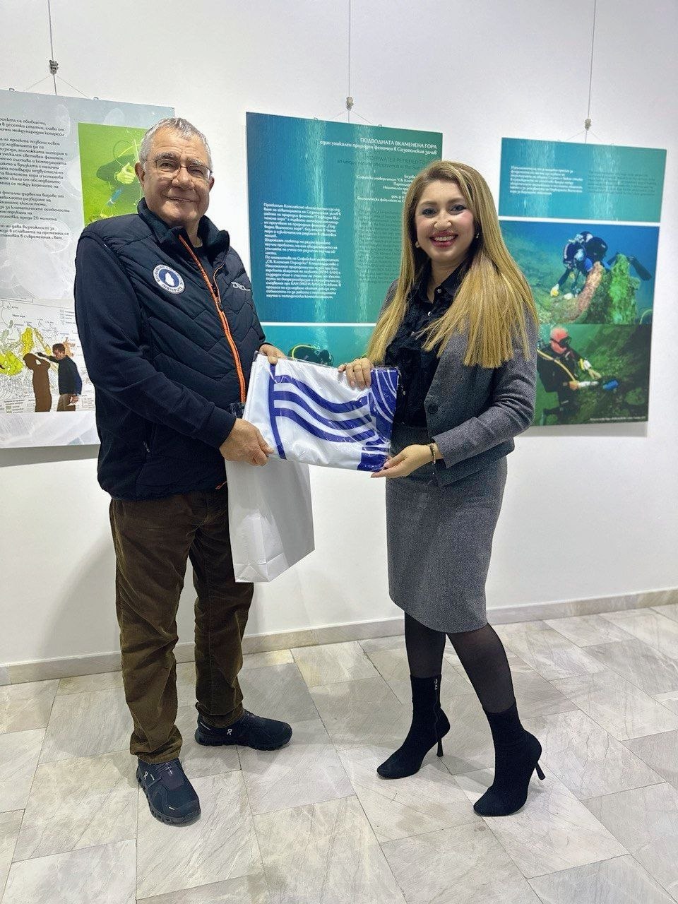 Зам.-кметът Златомира Стефанова връчи официалния флаг на проф. Христо Пимпирев по време на откриването на изложбата „Подводната вкаменена гора“