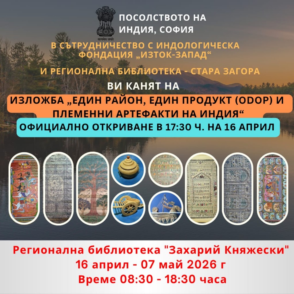 Изложбата „Един район, един продукт – племенни артефакти на Индия“ ще бъде открита на 16 април 2026 г. от 17.30 ч. в Регионална библиотека „Захарий Княжески“.