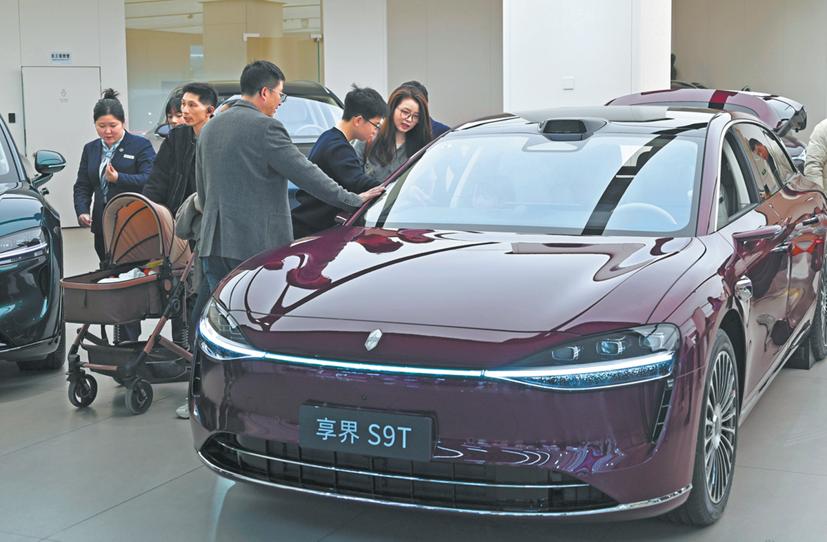Посетителите се запознават с домашно чисто ново енергийно превозно средство в търговски център в Neijiang, провинция Съчуан, на 21 февруари. TANG MINGRUN/ЗА КИТАЙ ДАЙЛИ
