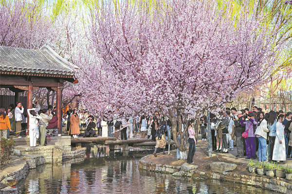 Посетителите се радват на цъфтящи цветя в парка Санлихе в Пекин на 22 март. CHEN YEHUA/XINHUA