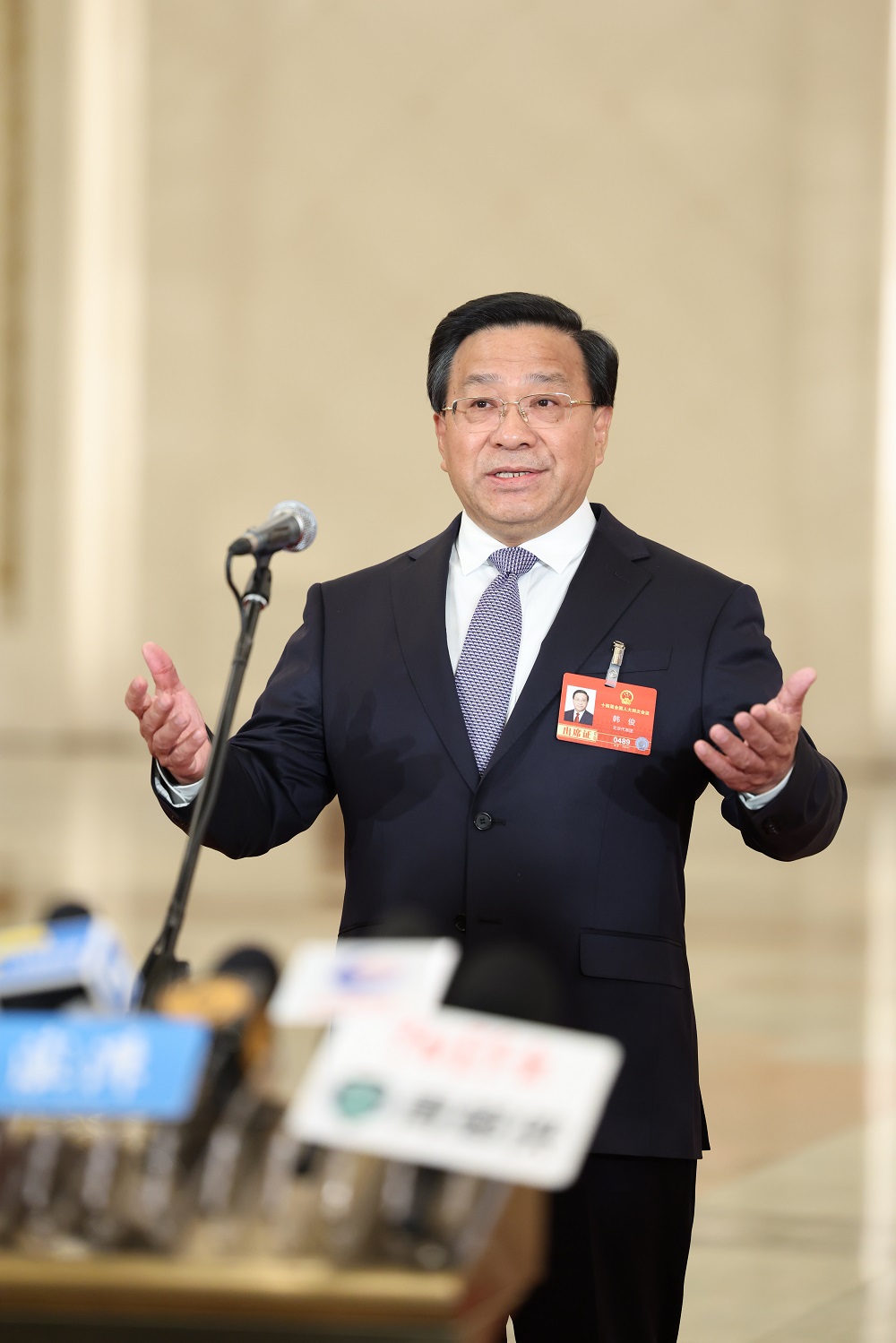 Китайският министър на земеделието и селските въпроси Хан Джун дава интервю след второто пленарно заседание на четвъртата сесия на 14-то Общокитайско събрание на народните представители (NPC) в Голямата зала на народа в Пекин, 9 март 2026 г. [Photo by Wang Jing/chindaily.com.cn]