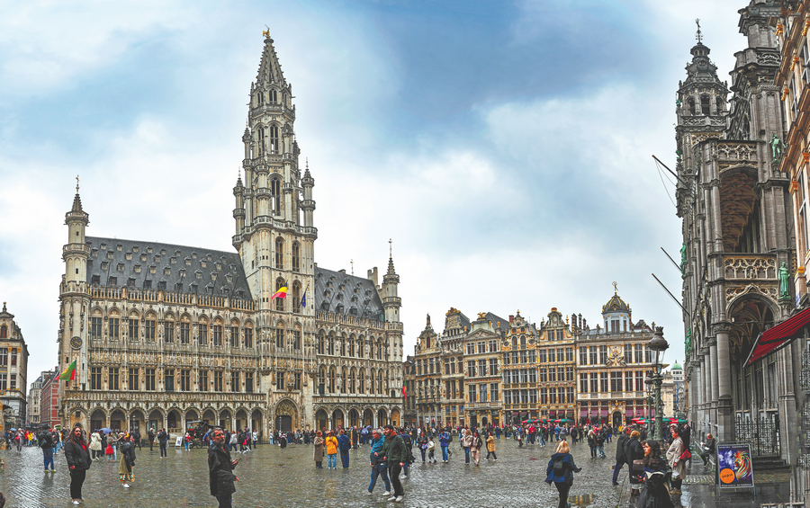 Ресторантите изпълват ъглите на площада с чат за вечери, техните маси на открито се претъпкаха под тенти. По тесните странични улици въздухът е подсладен от магазини за вафли, където дълги линии туристи чакат прясно пресовани вафли, напоени с разтопен шоколад. Онези, които се скитат с конус от пържени картофи или захарна вафла, често се оказват проследявани от другите редовни служители на площада: гълъби, мазнини и настойчиви, като се въртят отзад с надеждата за небрежна троха.
