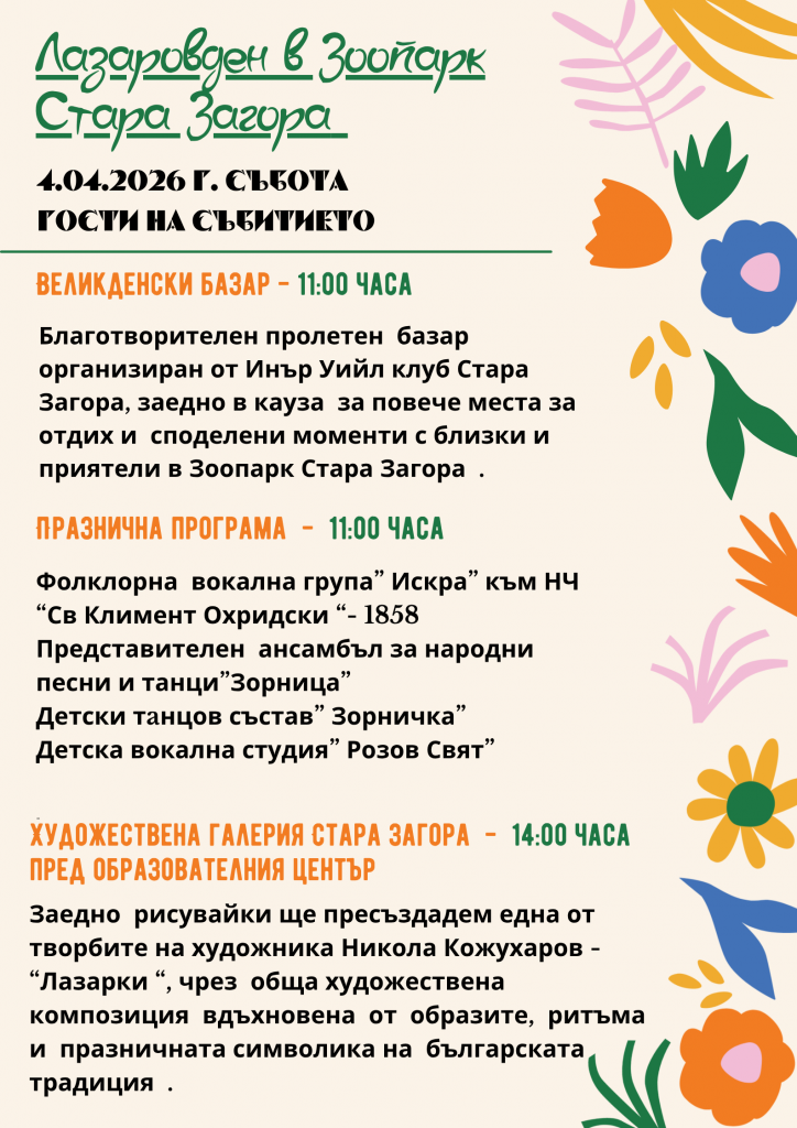 Зоопарк Стара Загора кани жителите и гостите на града на богата и весела празнична програма по повод Лазаровден. Събитието ще се проведе на 4 април 2026 г. (събота) и ще предложи разнообразни инициативи за цялото семейство.