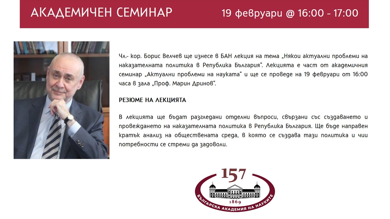 - Лекция на тема “Някои актуални проблеми на наказателната политика в Република България“ изнесе чл.-кор. Борис Велчев