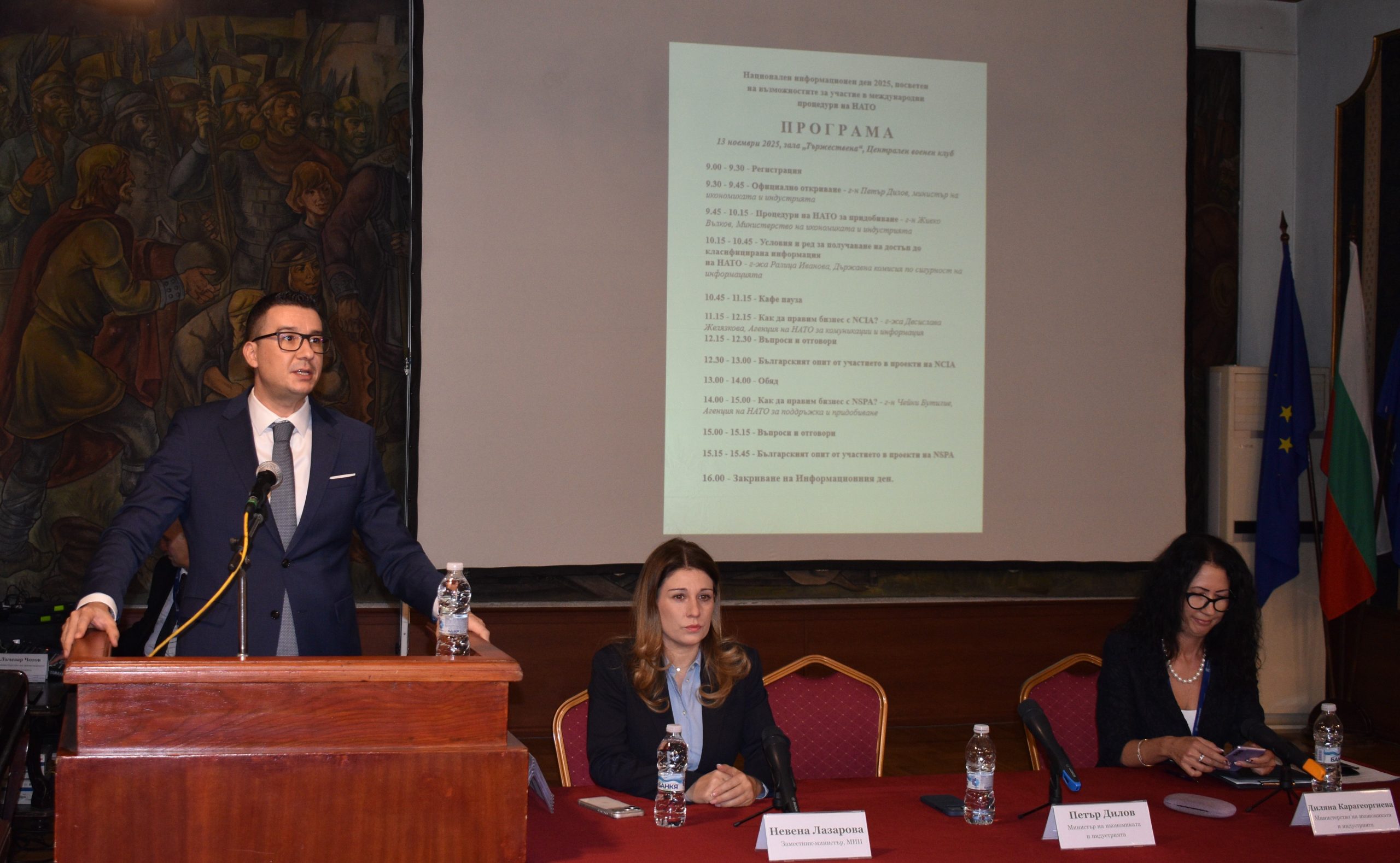 Участието в международните програми на НАТО не е само въпрос на икономически ползи, а израз на ангажираност, доверие и съюзническа солидарност. Това заяви министърът на икономиката и индустрията Петър Дилов, който откри Национален информационен ден, посветен на възможностите за участие в международни процедури на НАТО. Участие взе и заместник-министър Невена Лазарова.