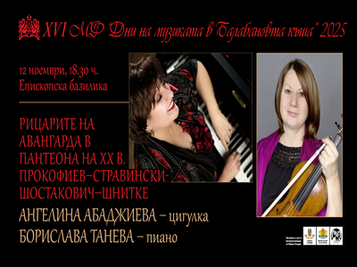 На 12 ноември в програмата на XVI Международен фестивал „Дни на музиката Балабановата къща“ ще прозвучи знаков концерт, под надслов „Рицарите на авангарда в пантеона на XX век“. В него са включени творби от Сергей Прокофиев, Игор Стравински, Дмитрий Шостакович и Алфред Шнитке, считани за едни от най-великите композитори на XX век. Произведенията ще оживеят на сцената на Епископската базилика на Филипопол в изпълнение на именитите инструменталистки с активна международна кариера Ангелина Абаджиева – цигулка и Борислава Танева – пиано. Началото на концерта е в 18.30 часа.