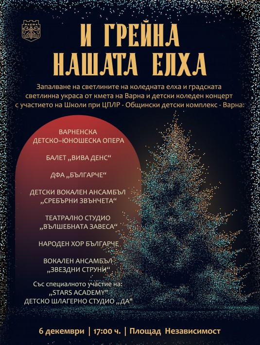 И тази година навръх Никулден – 6 декември (събота), ще грейне коледната елха на централния площад „Независимост“ във Варна. Светлините ще бъдат запалени от кмета Благомир Коцев по време на празничния концерт, който Община Варна традиционно организира в този ден.