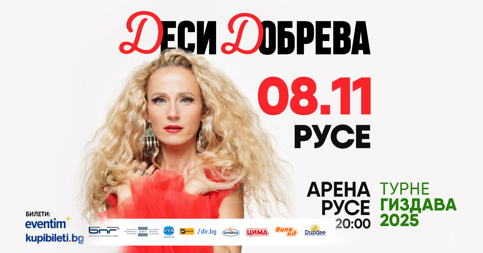 На 8 ноември от 20 ч. в зала „Арена Русе“ жителите на града ще имат възможност да се потопят в емоцията на концерт-спектакъла „Гиздава“ – част от националното турне на Деси Добрева, заедно с Лудо Младо Бенд, формация „Гераци“ и легендата Нешка Робева.