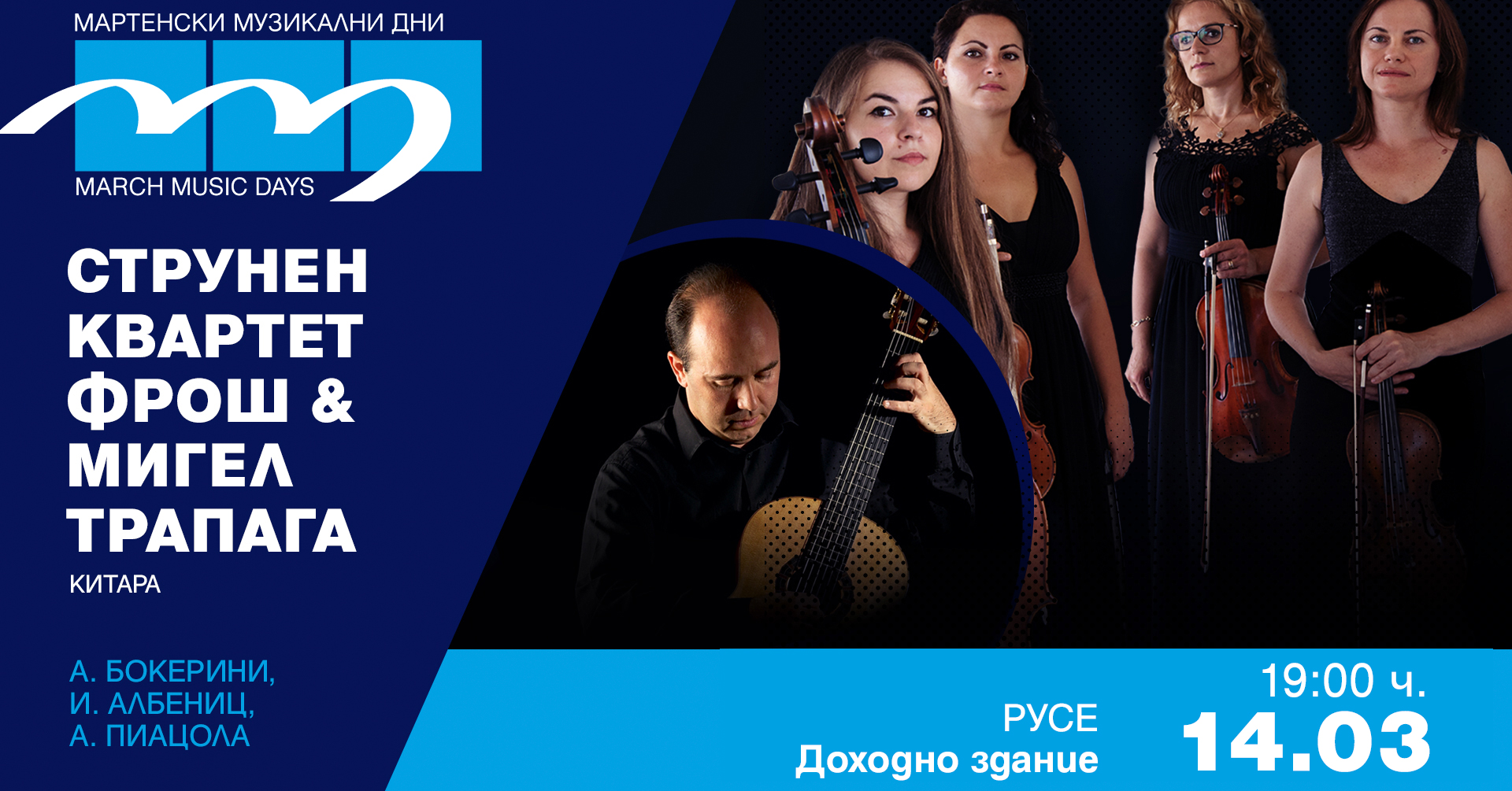 Вечерта продължава от 19 ч. в Голямата зала на Доходното здание с концерта на струнен квартет „Фрош“ и испанския китарист Мигел Трапага Санчес, който предизвика значителен интерес у публиката. Програмата е наситена с южен дух и виртуозност, включвайки емблематичния Квинтет „Фанданго“ от Луиджи Бокерини, шедьоври за соло китара от Исак Албениц и вълнуващия цикъл „Четирите сезона на Буенос Айрес“ от Астор Пиацола.