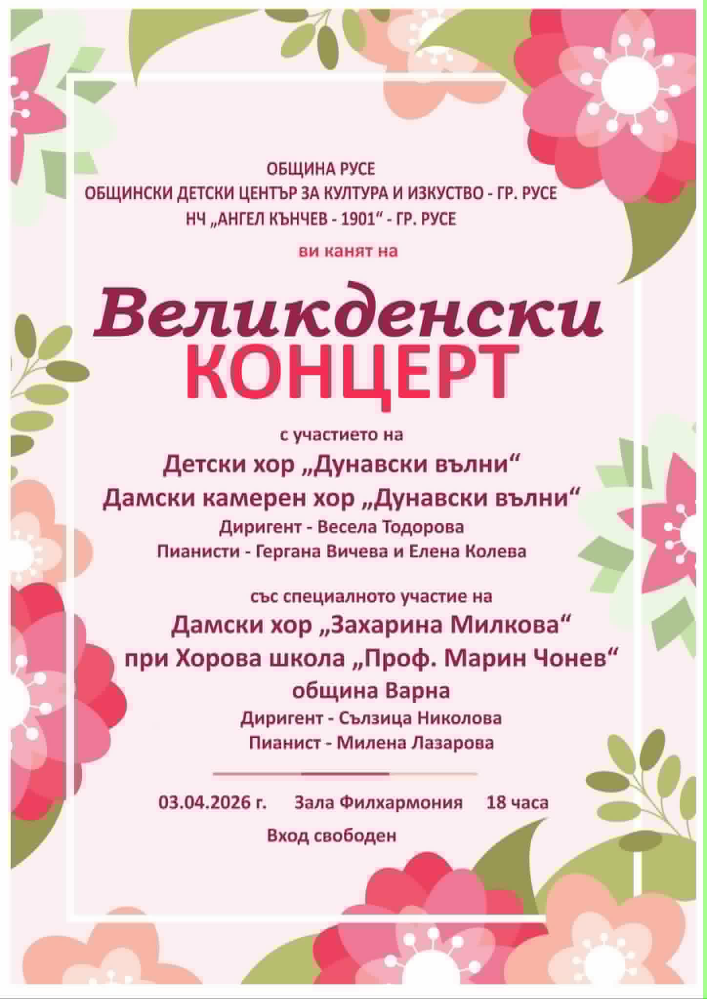 На 3 април от 18:00 ч. в зала „Филхармония“ Общинският детски център за култура и изкуство организира Великденски концерт. В него ще вземат участие Детски хор „Дунавски вълни“ и Дамски камерен хор „Дунавски вълни“ при НЧ „Ангел Кънчев – 1901“. Диригент на формациите е Весела Тодорова, а пианисти – Гергана Вичева и Елена Колева.