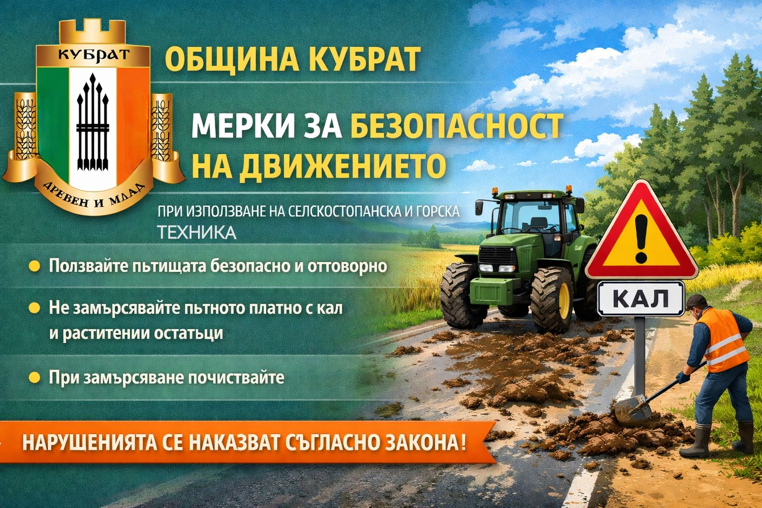 Със заповед на общинското ръководство, издадена на 19 януари 2026 г., Община Кубрат въвежда конкретни задължения за всички ползватели на селскостопанска, горска и специализирана техника. Мерките целят да се осигури безопасността на движението по пътищата, да се предотвратят пътнотранспортни произшествия и да се опазят живота и здравето на участниците в движението. Сред основните изисквания са […]