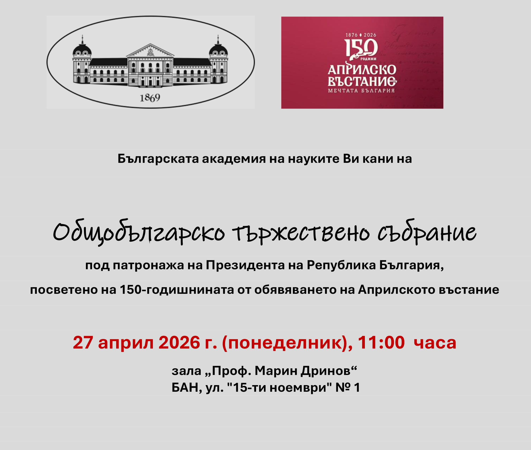 Общобългарско тържествено събрание, посветено на 150-годишнината от Априлското въстание, ще се проведе на 27 април в Българската академия на науките.