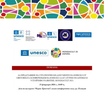 Регионален център за опазване на нематериалното културно наследство в Югоизточна Европа под егидата на ЮНЕСКО, Центърът за медийни изследвания, аудиовизуална политика и културни индустрии „доц. д-р Биляна Томова“ към катедра на ЮНЕСКО по медийна и информационна грамотност и културни политики за устойчиво развитие в УНСС, Комитет за връзка на НПО в ЮНЕСКО и Община Пловдив Ви канят на представяне на стратегически документи на ЮНЕСКО от Световната конференция на ЮНЕСКО за културни политики и устойчиво развитие – MONDIACULT 2025, която се проведе в периода 29 септември – 1 октомври 2025 г., Барселона, Испания.