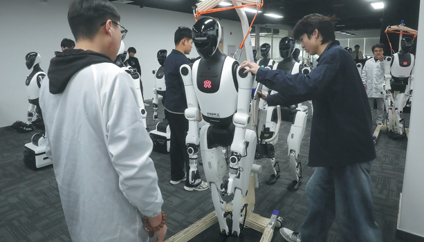 Членовете на персонала настройват и тестват хуманоидни роботи в пилотното съоръжение за валидиране на Пекинския иновационен център за хуманоидна роботика в четвъртък. Ган Нан/За Китай Daily