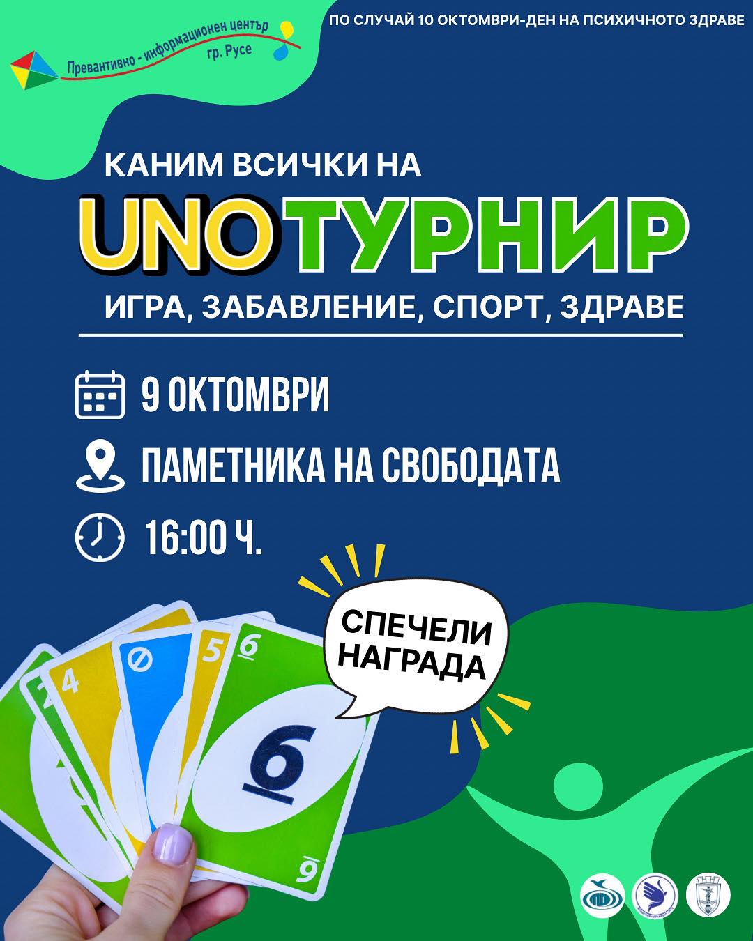Във връзка със Световния ден на психичното здраве, който се отбелязва на 10 октомври, на 9 октомври /четвъртък/ от 16 часа пред Паметника на свободата ще се проведе турнир по UNO – настолна игра с карти, организиран от Превантивно-информационния център по наркотични вещества – Русе и техните доброволци, съвместно с Общинския младежки дом и Младежкия парламент и със съдействието на Община Русе.