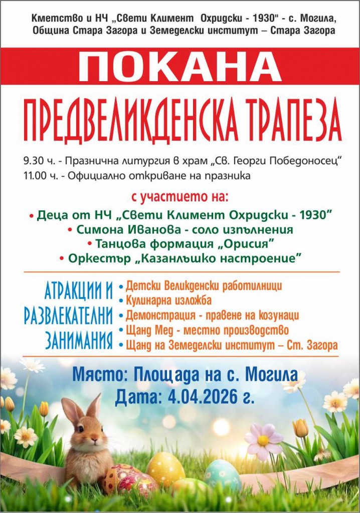В старозагорското село Могила подготвят пъстро тържество по повод обичания български празник Лазаровден с „Предвеликденска трапеза“ на 4 април 2026 г.