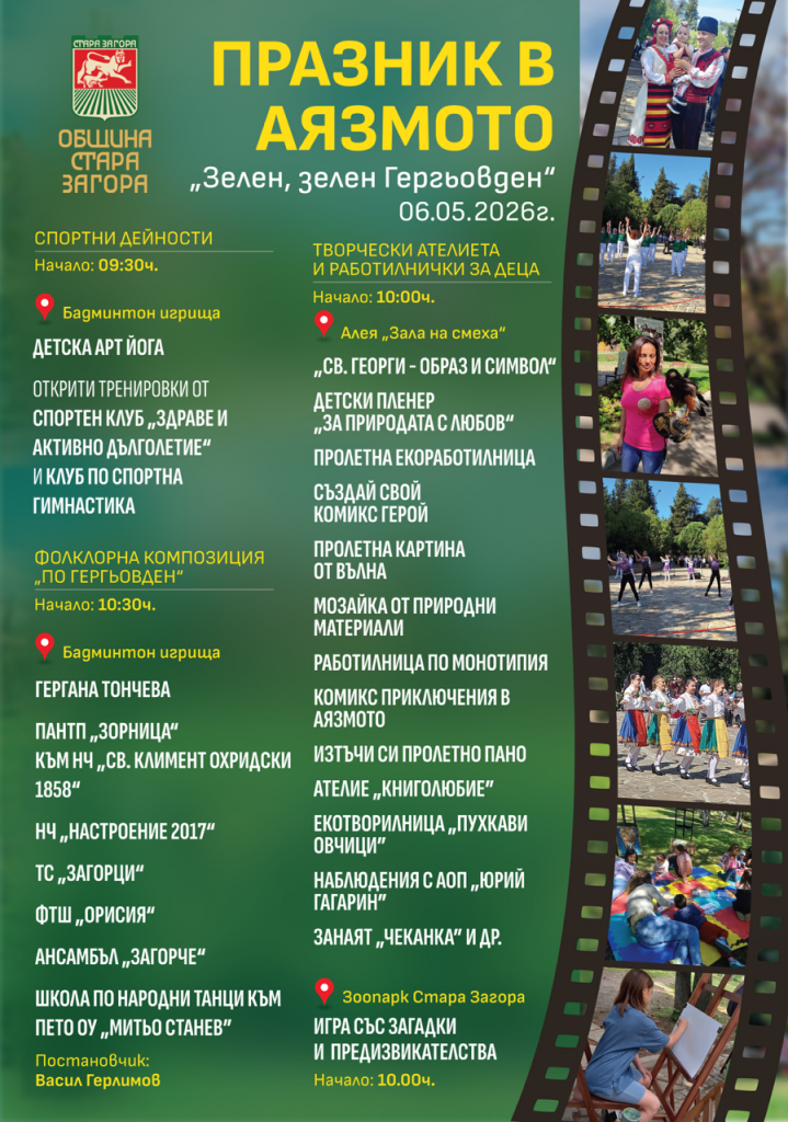 Община Стара Загора организира празник в парк „Аязмото“ на 6 май 2026 г. под надслов „Зелен, зелен Гергьовден“. Събитието ще започне в 09.30 ч. със спортни активности на бадминтон игрищата, включително детска арт йога и открити тренировки.