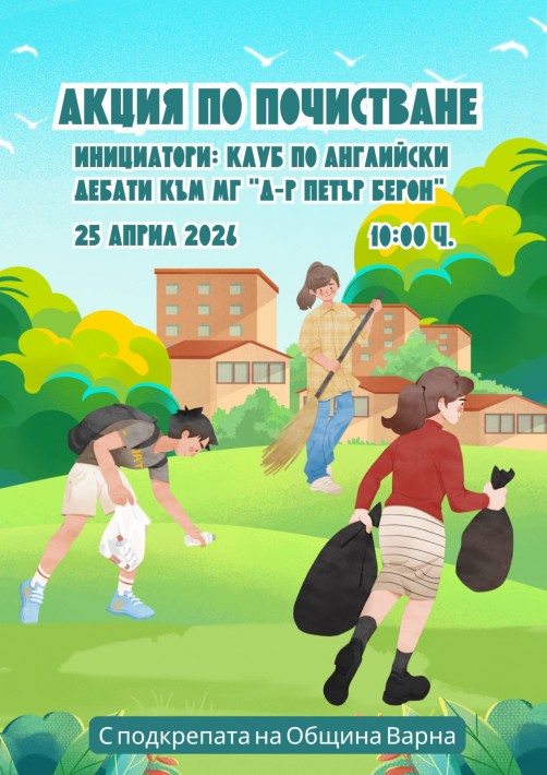 Ученици от Математическа гимназия „Д-р Петър Берон“ организират доброволческа акция по почистване в района около училището в ЖК „Чайка“. Инициативата е на Теодор Андреев и Кристиян Симеонов от Клуба по английски дебати към гимназията и ще се проведе от 10:00 ч. на 25.04.2026 г. (събота).