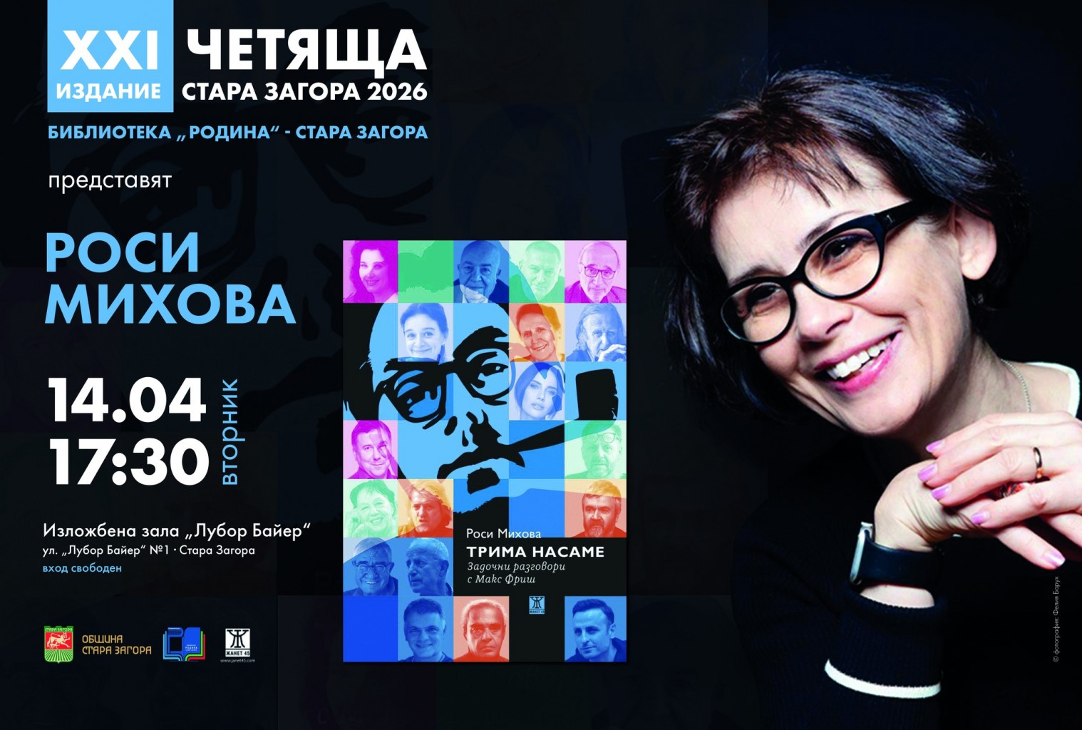 В рамките на ХХI издание на фестивала „Четяща Стара Загора“, Библиотека „Родина“ и издателство „Жанет 45“ канят жителите и гостите на града на среща с журналиста и автор Росица Михова и представяне на книгата ѝ „Трима насаме. Задочни разговори с Макс Фриш“.
