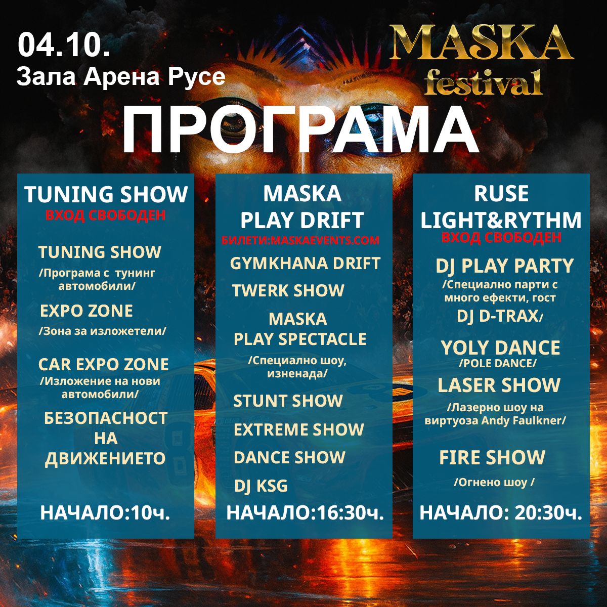 Нощният дрифт спектакъл “MASKA PLAY”, който няма аналог в България, започва на паркинга на „Арена Русе“ от 16:30 часа. Той ще предложи напълно нова концепция с впечатляващи визуални ефекти, професионални пилоти и сценография, вдъхновена от глобални развлекателни формати. Зрителите с предварително закупени билети ще имат възможност да се насладят на „Gymkhana Drift“ – дрифт с препятствия, на стънт шоу с мотоциклети и акробатични изпълнения, както и на уникално нощно дрифт шоу. За доброто настроение ще се погрижи DJ KSG, който ще поддържа високата енергия през целия спектакъл. В програмата са включени още много изненади.