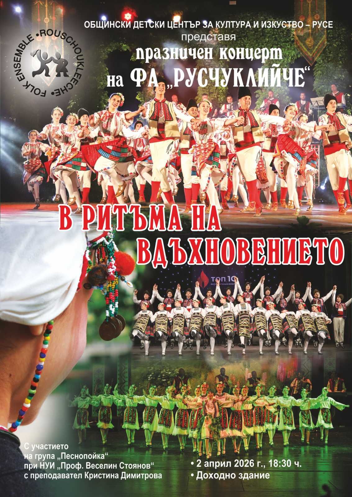 На 2 април /четвъртък/ от 18:30 ч. в Голяма зала на Доходно здание ще се състои самостоятелен концерт „В ритъма на вдъхновението“ на Фолклорен ансамбъл „Русчуклийче“ към Общински детски център за култура и изкуство – Русе.