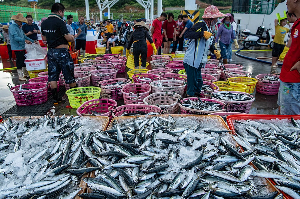 Рибари разтоварват улова си на кея в Ванинг, провинция Хайнан, на 22 август 2025 г. [Photo/VCG]