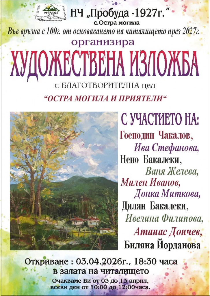 За трета поредна година НЧ “Пробуда – 1927 г., с. Остра могила, в навечерието на светлите великденски празници, организира художествена изложба с благотворителна цел „Остра могила и приятели“ в която участват творци от Стара Загора и региона. Тази година ще бъдат показани творби на художниците Господин Чакалов, Ива Стефанова, Нено Бакалски, Ваня Желева, Милен Иванов, Донка Миткова, Делян Бакалски, Ивелина Филипова, Атанас Дончев, Биляна Йорданова, Мишо Михайлов и Мария Енгстад.