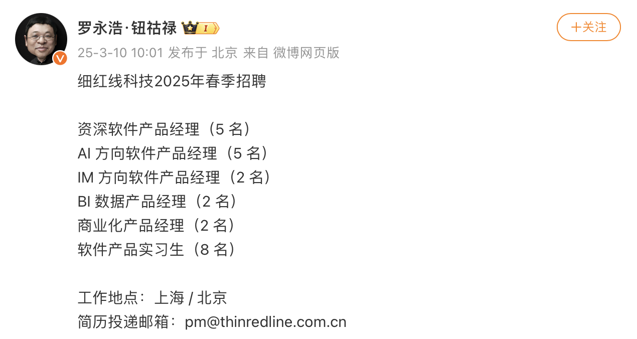 Стартиращата компания за изкуствен интелект на Luo Yonghao, Thin Red Line, започна наемането на служители през пролетта на 2025 г., според неговите данни от 10 март публикация в социалните медии. Компанията набира продуктови мениджъри за AI, IM, BI данни и комерсиализация с позиции, базирани в Шанхай и Пекин. Подробности за заплатите не бяха оповестени. Китайската медия iThome наскоро съобщи, че Луо измества фокуса към операционните системи с изкуствен интелект (AIOS) и е наел Уанг Венджунбивш старши служител на Xiaomi с опит в операционните системи. Вместо да стартира нова компания, Luo се разширява в рамките на Thin Red Line. През януари той намекна за своите AIOS амбиции, цитиране мнението на компютърния пионер Алън Кей, че сериозните софтуерни новатори разработват свой собствен хардуер. [Jiemian, in Chinese]